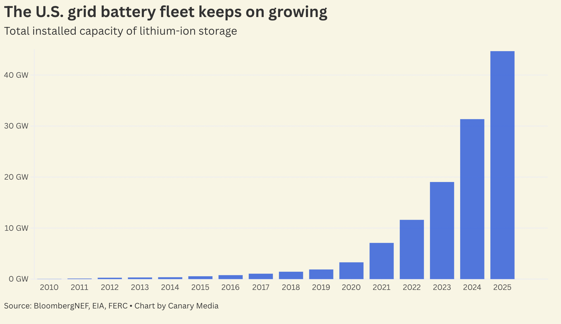 More than 13 gigawatts of energy storage was installed across the U.S. last year, per a new report from the Business Council for Sustainable Energy and BloombergNEF. That’s up from the roughly 12 GW installed in 2024.