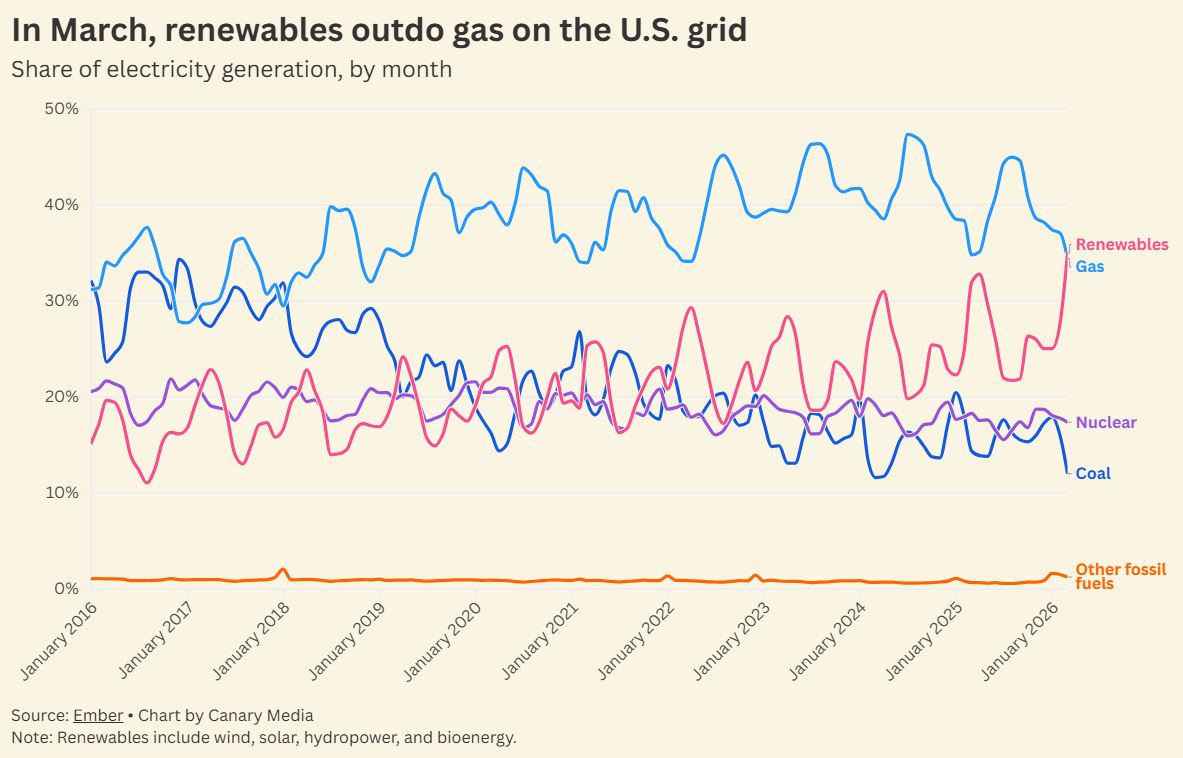 Renewables reign: In March, renewables generated more power than gas across a whole month, marking a first for the U.S. grid. (Canary Media)